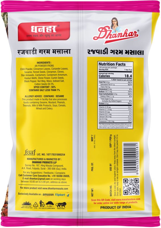 We are a prominent Manufacturer and Supplier of Rajwadi Garam Masala. Rajwadi Garam Masala is widely used in several cuisines such as dals and vegetables for providing them great taste. Our range of Rajwadi Garam Masala uses quality raw material such as green cardamoms, cinnamon sticks, coriander seeds, cumin seeds, red chilies, turmeric powder etc. for manufacturing.